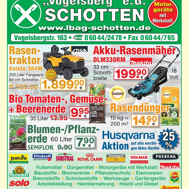 Der Frühling ist da – und mit ihm die perfekte Zeit, Garten und Hof auf Vordermann zu bringen. Die aktuellen Angebote der LBAG Schotten bieten alles, was du jetzt brauchst: vom leistungsstarken Rasenmäher über hochwertige Erde bis hin zu praktischen Garten-, Motor- und Akkugeräten.